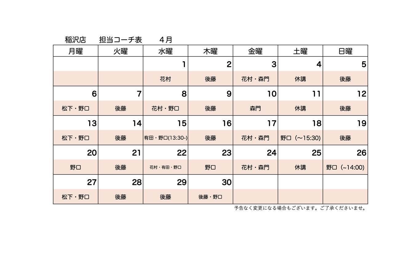 4月レッスンスケジュールが完成致しましたので受付を開始いたします。