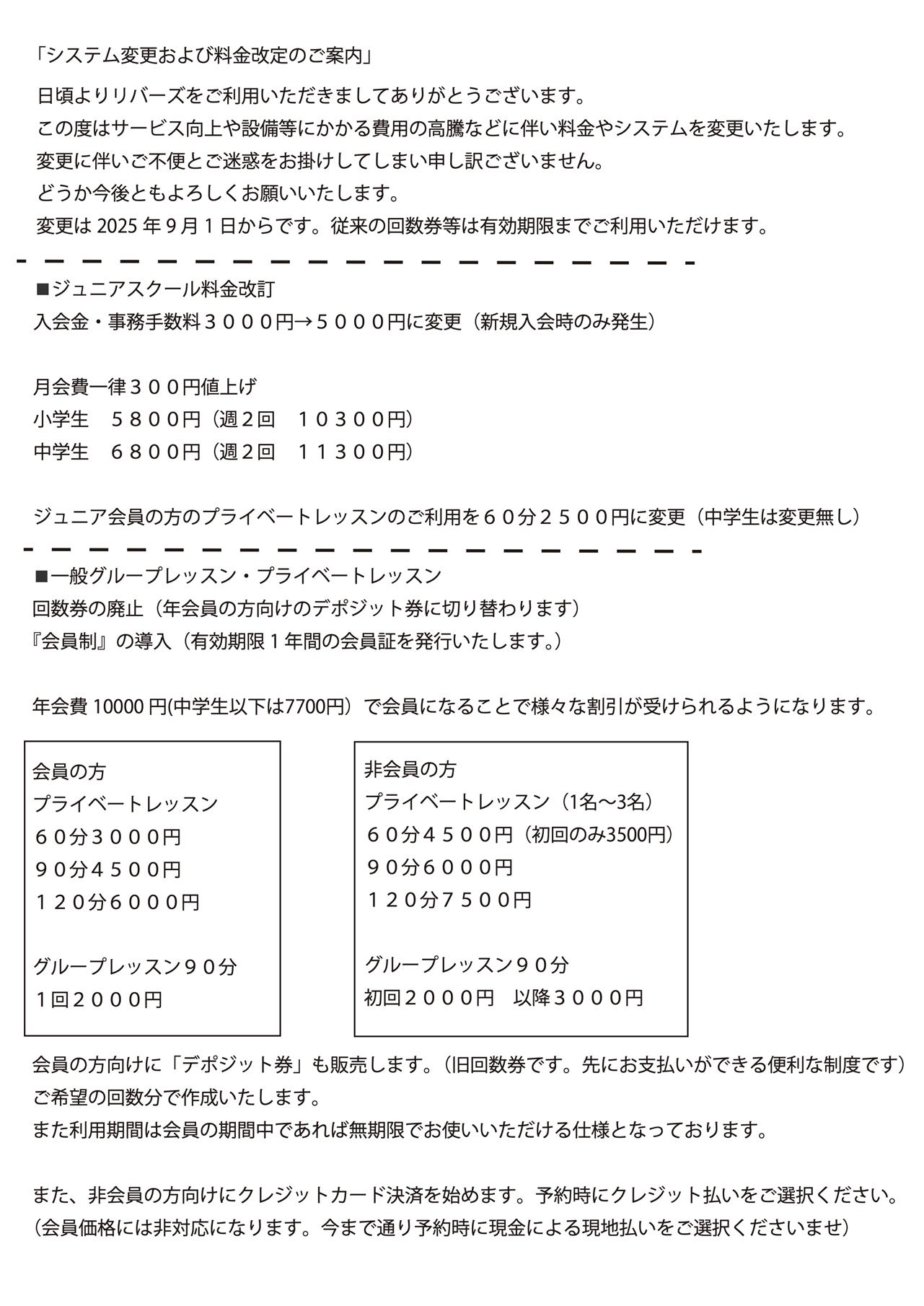 ジュニアスクールやプライベートレッスンなどで値上げがあります。次の資料をご確認くださいませ。