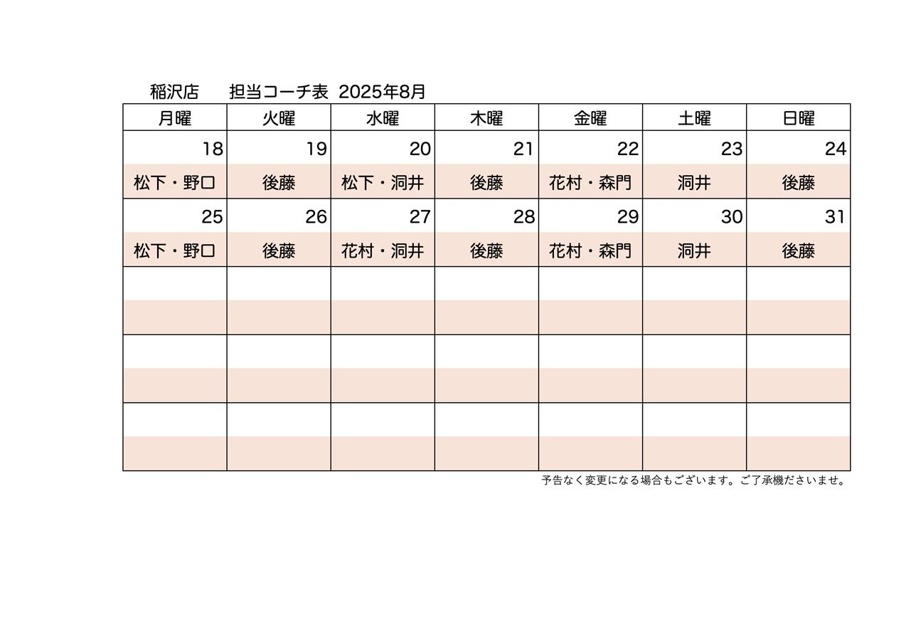8月のレッスンスケジュールが完成致しましたので受付を開始いたします。