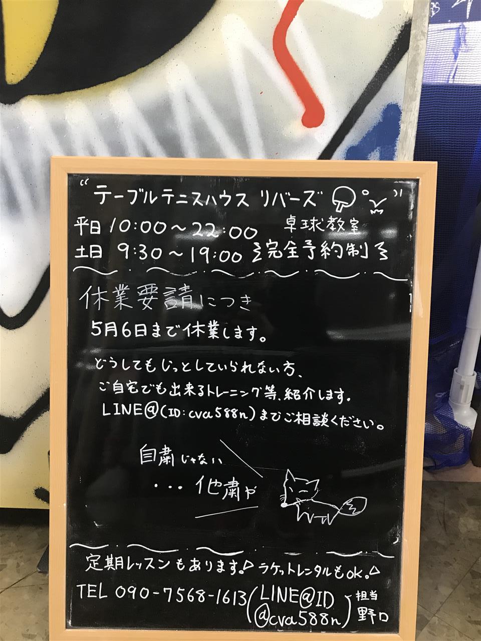 リバーズ卓球教室定期スクールは緊急事態宣言が空ける5月6日まで休講にします。