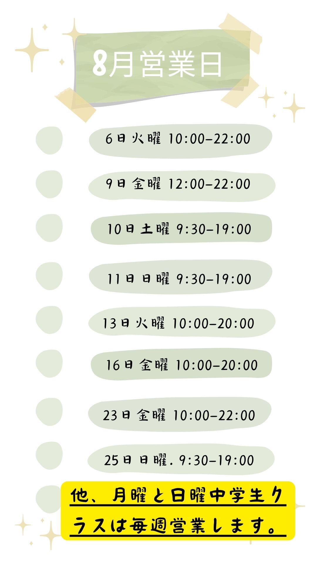 基本的には、月曜日と日曜日中学生クラス(19:00〜20:30)のみの営業です。