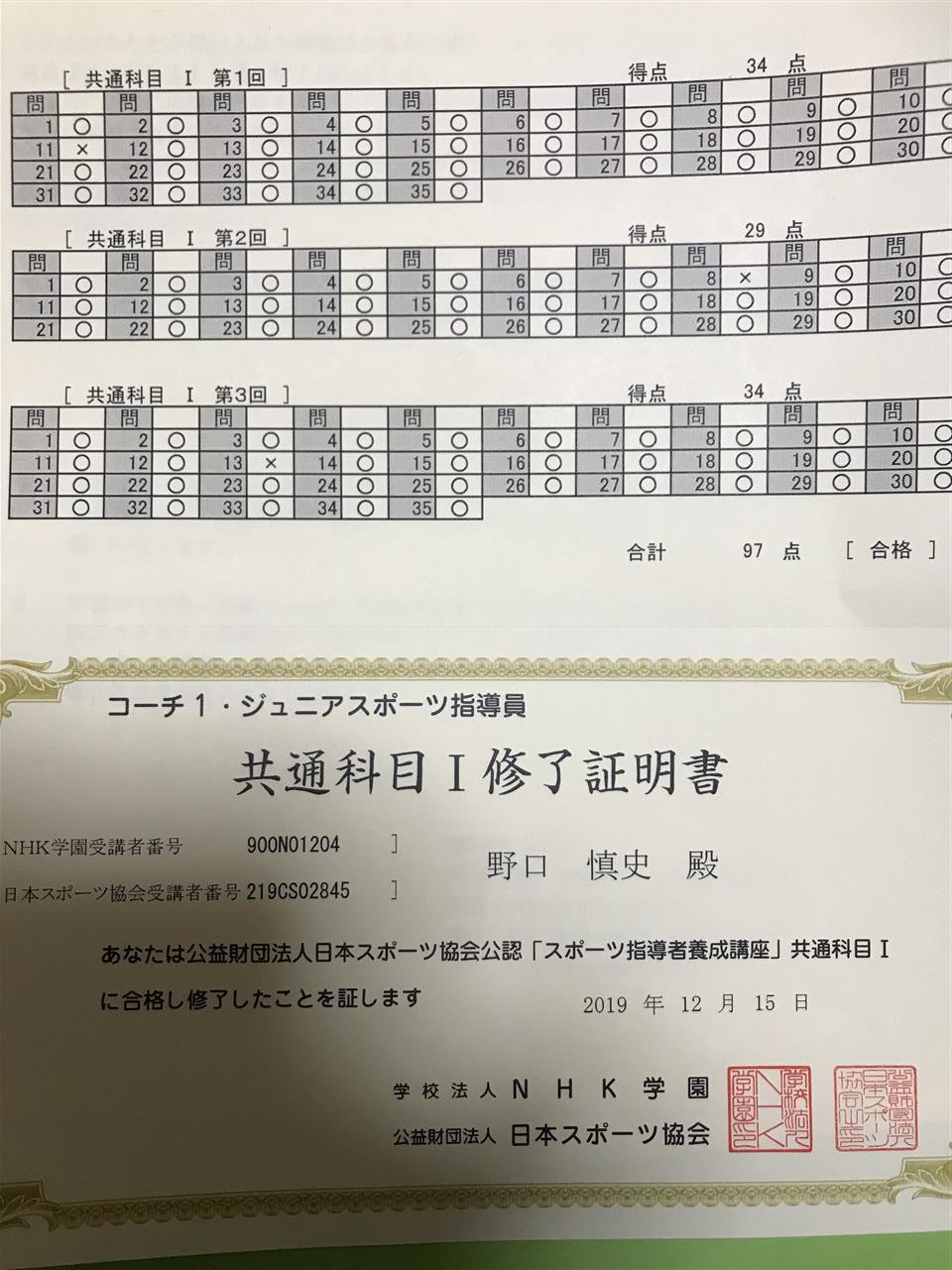 あと夏からやって最近終わったコーチ1の共通学科の認定証が届きました🙆♂️