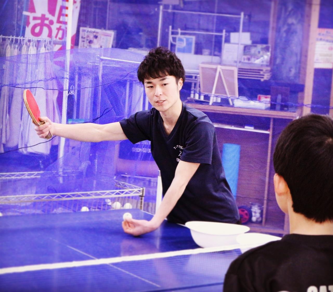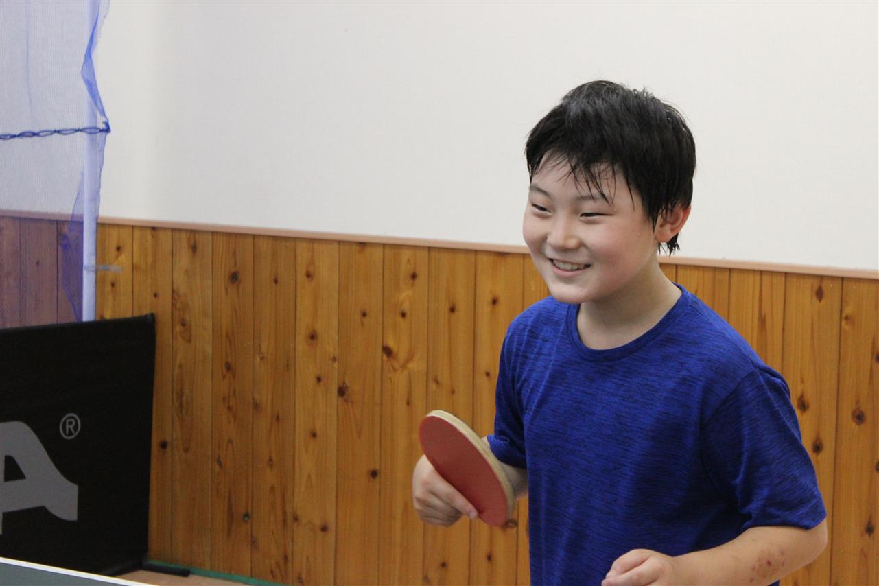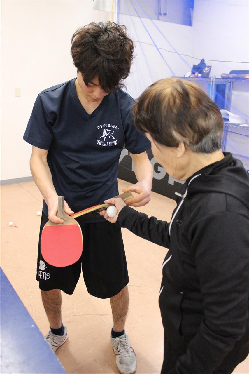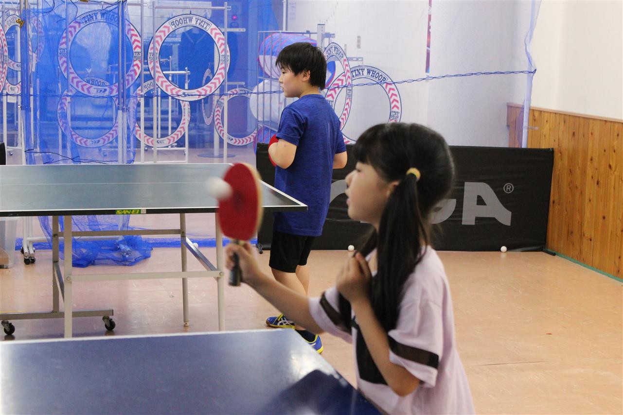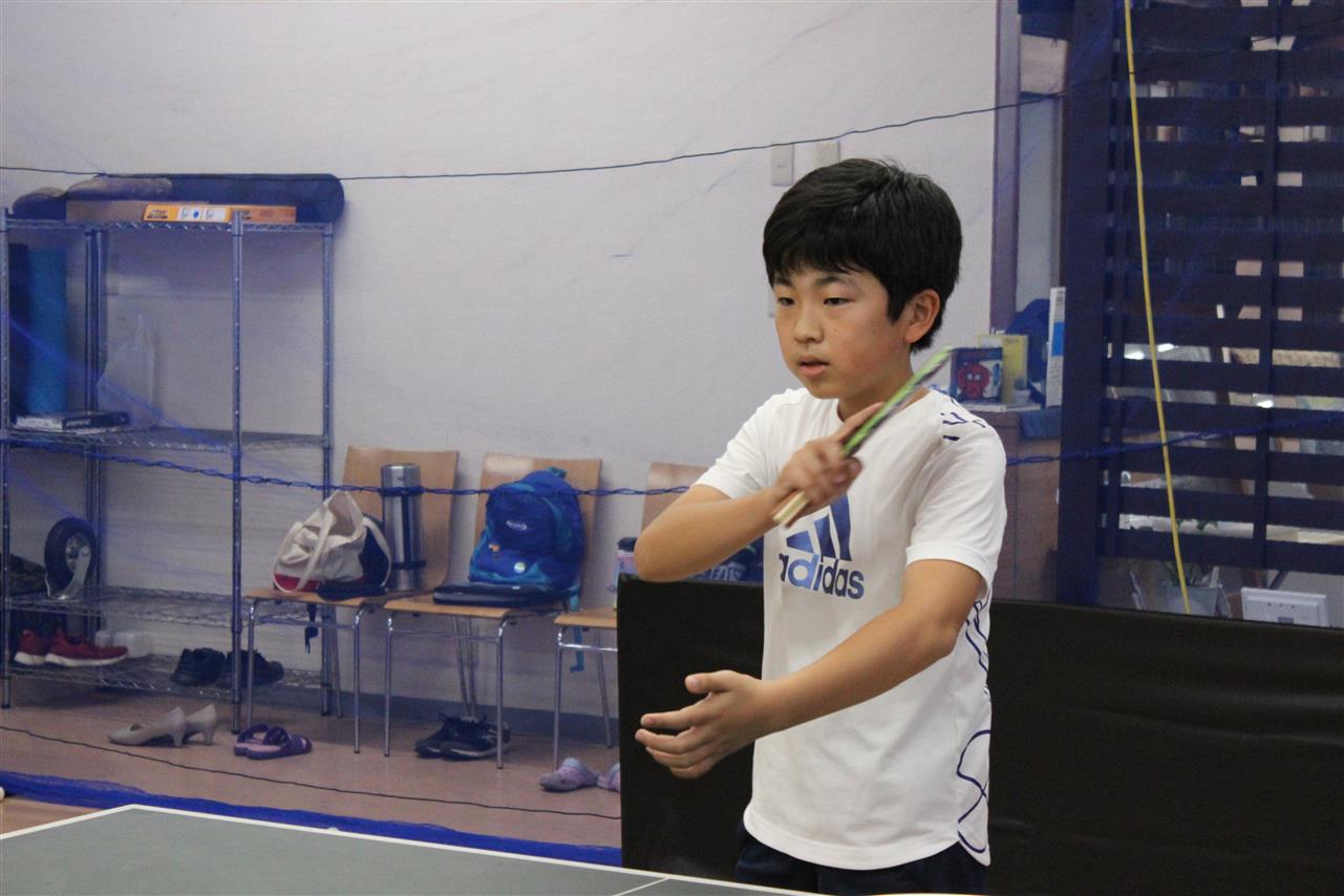 レッスン風景です。準備体操から始まって、ラケットの握り方から、基礎打ち、感覚的な練習や多球練習、システム練習を行います。